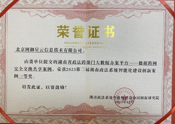網御星云作為協辦單位受邀出席本次大會,公司申報的“湖南省政法跨部門大數據辦案平臺——數據跨網安全交換共享案例”榮獲2023第三屆湖南政法系統智能化建設創(chuàng)新案例一等獎!