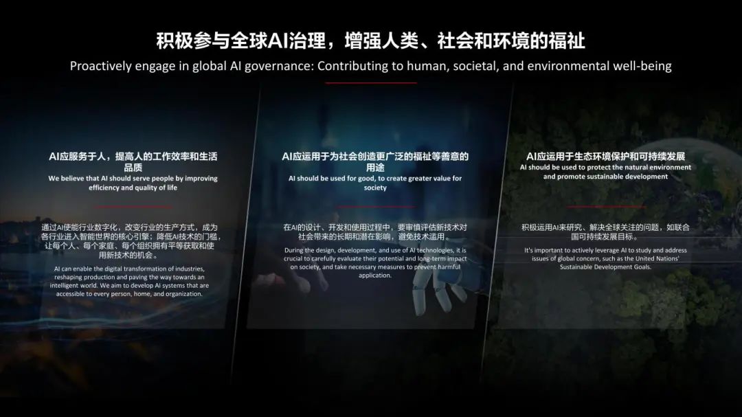 我們認(rèn)為AI應(yīng)服務(wù)于人,提高人的工作效率和生活品質(zhì),通過AI使能行業(yè)數(shù)字化,改變行業(yè)的生產(chǎn)方式,成為各行業(yè)進(jìn)入智能世界的核心引擎;要持續(xù)降低AI的技術(shù)門檻,讓每個(gè)人、每個(gè)家庭、每個(gè)組織擁有平等獲取和使用新技術(shù)的機(jī)會(huì)。同時(shí),AI應(yīng)運(yùn)用于為社會(huì)創(chuàng)造更廣泛的福祉等善意的用途,在AI的設(shè)計(jì)、開發(fā)和使用過程中,要審慎評(píng)估新技術(shù)對(duì)社會(huì)帶來(lái)的長(zhǎng)期和潛在影響,避免技術(shù)濫用。以及,AI應(yīng)運(yùn)用于生態(tài)環(huán)境保護(hù)和可持續(xù)發(fā)展,積極運(yùn)用AI來(lái)研究、解決全球關(guān)注的問題,如聯(lián)合國(guó)可持續(xù)發(fā)展目標(biāo)。