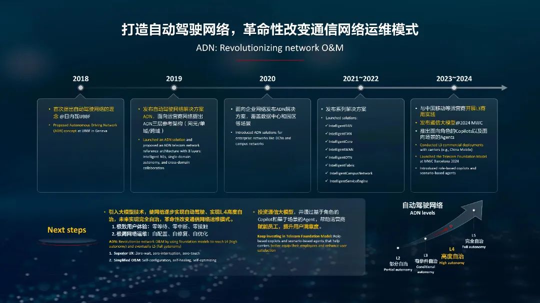 ? 打造自動(dòng)駕駛網(wǎng)絡(luò),革命性改變通信網(wǎng)絡(luò)運(yùn)維模式。電信運(yùn)營(yíng)商網(wǎng)絡(luò)運(yùn)維是非常復(fù)雜的,因此成本也非常高。因此在2018年的日內(nèi)瓦UBBF,華為參考汽車自動(dòng)駕駛的分級(jí)理念提出了自動(dòng)駕駛網(wǎng)絡(luò)的概念,也就是ADN(Autonomous Driving Network)。經(jīng)過這么多年和電信運(yùn)營(yíng)商持續(xù)的探討、聯(lián)合創(chuàng)新,形成了大量的ADN解決方案,到今天,ADN已經(jīng)成為網(wǎng)絡(luò)運(yùn)維智能化轉(zhuǎn)型的戰(zhàn)略共識(shí)。而大模型出來(lái)以后,自動(dòng)駕駛網(wǎng)絡(luò)的目標(biāo)更加具有現(xiàn)實(shí)意義了,運(yùn)營(yíng)商都希望自己的網(wǎng)絡(luò)能夠盡快實(shí)現(xiàn)自動(dòng)駕駛、實(shí)現(xiàn)L4高度自治,未來(lái)實(shí)現(xiàn)完全自治,帶來(lái)以“零等待、零中斷、零接觸”為標(biāo)志的極致的用戶體驗(yàn),和以“自配置、自修復(fù)、自優(yōu)化”為標(biāo)志的極簡(jiǎn)的網(wǎng)絡(luò)運(yùn)維。華為將與中國(guó)及全球運(yùn)營(yíng)商合作打造通信大模型,并首先通過基于角色的Copilot和基于場(chǎng)景的Agent,幫助運(yùn)營(yíng)商賦能員工,提升用戶滿意度,讓運(yùn)營(yíng)商盡快因大模型技術(shù)和自動(dòng)駕駛網(wǎng)絡(luò)而獲益。