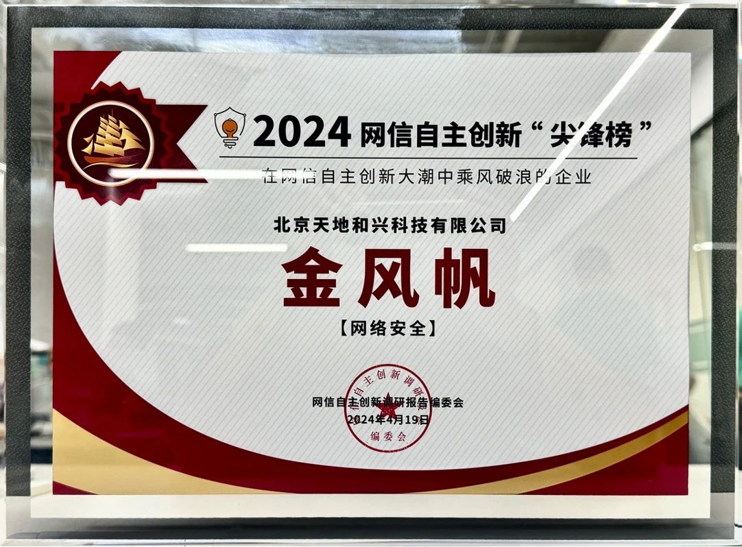 在報(bào)告發(fā)布之際,報(bào)告編委會推選了具有突出創(chuàng)新能力、取得顯著創(chuàng)新成果、能夠代表創(chuàng)新水平、做出卓越創(chuàng)新貢獻(xiàn)的企業(yè)等予以表彰。天地和興作為在網(wǎng)信自主創(chuàng)新大潮中乘風(fēng)破浪的企業(yè),被授予2024網(wǎng)信自主創(chuàng)新尖鋒榜“金風(fēng)帆獎(jiǎng)”。