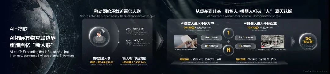 第三,移動(dòng)AI時(shí)代將極大拓展萬(wàn)物互聯(lián)的邊界。隨著機(jī)器獲得類(lèi)人的思維和移動(dòng)性能力,網(wǎng)絡(luò)聯(lián)接將從“碳基人”拓展到“硅基人”,再造百億新人聯(lián)。對(duì)于個(gè)人,未來(lái)每個(gè)人都將擁有一個(gè)AI助理,跨手機(jī)、眼鏡和新型AI終端運(yùn)行。AI數(shù)智人從工具進(jìn)化為伙伴,實(shí)時(shí)響應(yīng)生活、工作、學(xué)習(xí)全場(chǎng)景需求;對(duì)于行業(yè),每一個(gè)智慧工廠將配備AI大腦,驅(qū)動(dòng)AI機(jī)器員工深入各生產(chǎn)環(huán)節(jié)。AI機(jī)器員工將具備自主學(xué)習(xí)和精準(zhǔn)響應(yīng)的能力,使能生產(chǎn)、維護(hù)、質(zhì)檢、物流等全場(chǎng)景提質(zhì)增效。“數(shù)智人”和“機(jī)器人”將突破傳統(tǒng)聯(lián)接天花板,創(chuàng)造數(shù)百億的“新人聯(lián)”,引領(lǐng)人機(jī)融合的新紀(jì)元。