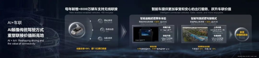 第二,智能網(wǎng)聯(lián)汽車(chē)將顛覆傳統(tǒng)駕駛方式,提供更加愉悅和安心的出行服務(wù)。智能座艙,將顛覆人們的乘車(chē)體驗(yàn)。Gbps網(wǎng)絡(luò)體驗(yàn)支持智慧助手、多屏觀看和XR應(yīng)用等需求,使車(chē)輛成為集休閑、娛樂(lè)和工作于一體的'移動(dòng)第三空間'。智能駕駛,將顛覆傳統(tǒng)的駕駛模式。通過(guò)每月百GB的數(shù)據(jù)上傳訓(xùn)練,智駕系統(tǒng)不斷提高模型準(zhǔn)確性,精準(zhǔn)識(shí)別和響應(yīng)多樣化交通環(huán)境;同時(shí),基于毫秒級(jí)的車(chē)路協(xié)同,將實(shí)時(shí)提供穩(wěn)定可靠的駕駛策略。智能網(wǎng)聯(lián)汽車(chē)將兌現(xiàn)車(chē)聯(lián)體驗(yàn)價(jià)值,進(jìn)一步帶來(lái)時(shí)間價(jià)值和安全價(jià)值,重塑聯(lián)接價(jià)值的新高地。