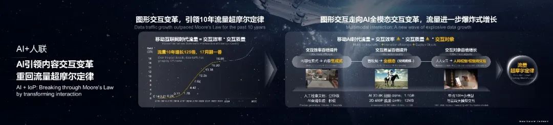 第一,圖形交互變革在過(guò)去10年推動(dòng)了移動(dòng)流量快速增長(zhǎng),DoU在過(guò)去十年增長(zhǎng)120多倍,平均每17個(gè)月翻一番,流量增速超摩爾定律。我們認(rèn)為,移動(dòng)AI時(shí)代將引領(lǐng)內(nèi)容交互的再次變革,隨著生成式內(nèi)容將會(huì)取代檢索式成為主流,交互效率百倍提升;隨著AIGC將推動(dòng)3D、空間視頻等全模態(tài)內(nèi)容生產(chǎn),交互信息量百倍提升;隨著終端將內(nèi)置大量本地小模型與云端大模型實(shí)時(shí)協(xié)同,交互對(duì)象百倍提升。這將將促進(jìn)移動(dòng)流量爆炸式增長(zhǎng),重回流量超摩爾定律。