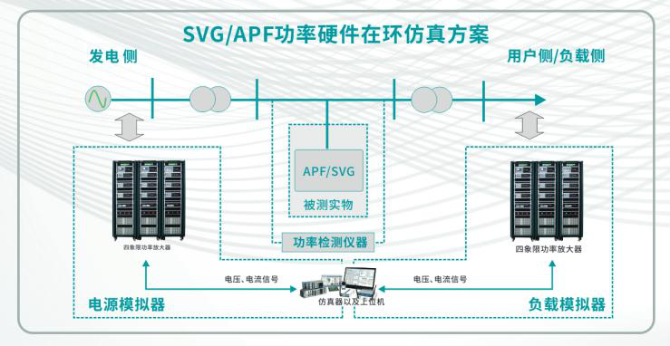 SVG/APF功率硬件在環(huán)仿真方案:在新型電力系統(tǒng)應(yīng)用場景中,PAS放大器與仿真器的結(jié)合,能夠?qū)Πl(fā)電側(cè)和負(fù)載側(cè)進(jìn)行數(shù)字化模擬,結(jié)合功率檢測儀的實測數(shù)據(jù),通過數(shù)據(jù)采集系統(tǒng),可實現(xiàn)以APF,SVG為被測設(shè)備的半實物功率硬件在環(huán)仿真測試。