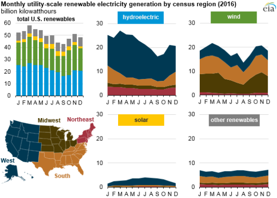 從發(fā)電量來看,今年3月份,美國可再生能源發(fā)電量達(dá)到全年最高。從地方來看,大部分可再生能源來自西部地區(qū),尤其是水電(占63%)和太陽能發(fā)電(占77%)。風(fēng)電產(chǎn)業(yè)相對發(fā)展比較均衡,中部地區(qū)占37%,南部占35%,西部占24%,東北部地區(qū)占4%。