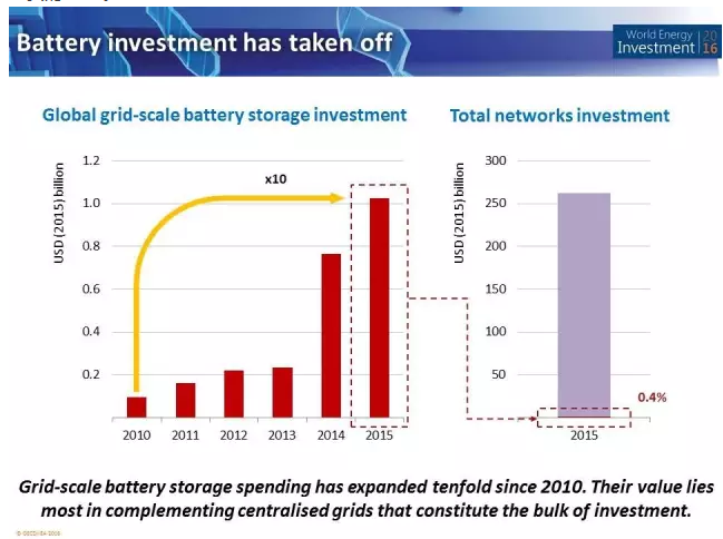 電力儲能投資2015年超過100億美元,過去十年以10%的系數(shù)在增長;但是儲能投資僅占電網(wǎng)投資的0.4%。