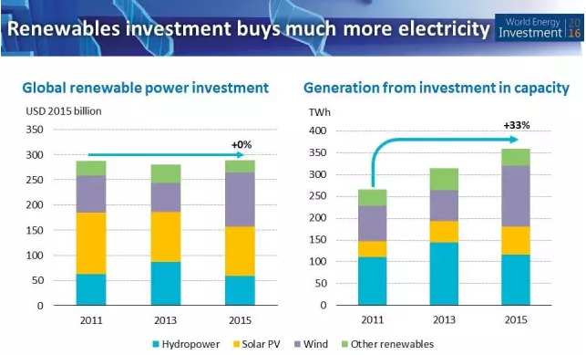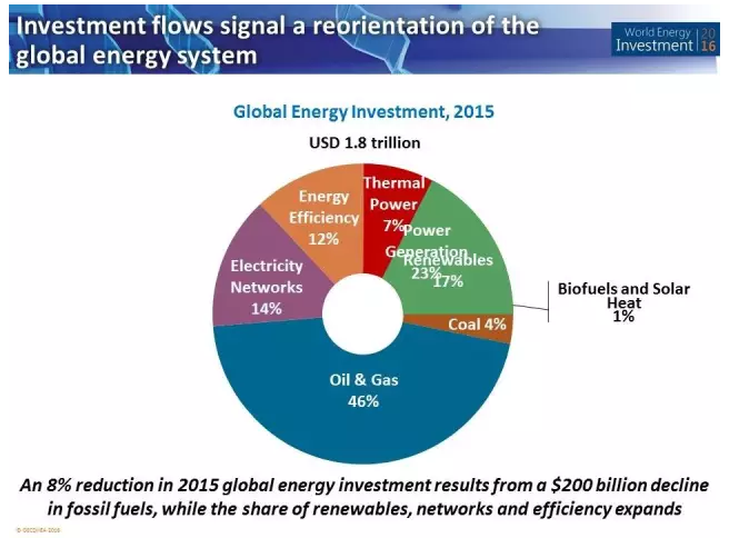 2015年電力行業(yè)投資達到了創(chuàng)紀錄的6900億美元,超過能源總投資的37%。可再生能源投資占17%,約占了電力投資的一半??稍偕茉赐顿Y中,16%來自發(fā)電,生物和太陽能只占1%。