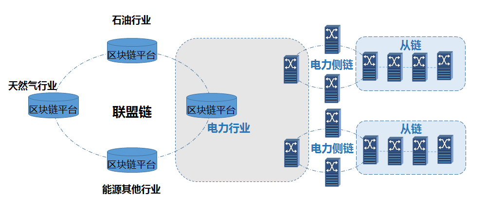 “主、側(cè)、從”多鏈混合架構(gòu)模式能夠適應(yīng)體量大、業(yè)務(wù)雜、數(shù)據(jù)并發(fā)率高的能源行業(yè),并且具有良好的節(jié)點(diǎn)擴(kuò)展性與可靠性。其中,主鏈覆蓋能源領(lǐng)域各企業(yè),提供基于區(qū)塊鏈的跨企業(yè)數(shù)據(jù)交互和共享服務(wù);側(cè)鏈向能源領(lǐng)域某一行業(yè)進(jìn)行延伸,覆蓋行業(yè)內(nèi)相關(guān)企業(yè),支撐主鏈更廣范圍覆蓋、更全面數(shù)據(jù)交互應(yīng)用;從鏈則以實(shí)際業(yè)務(wù)應(yīng)用需求為導(dǎo)向,進(jìn)行應(yīng)用擴(kuò)展,支撐主、從鏈實(shí)現(xiàn)應(yīng)用的全覆蓋。