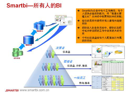 數(shù)據(jù)應(yīng)用即為數(shù)據(jù)的應(yīng)用、交換與服務(wù),需要通過(guò)思邁特軟件Smartbi等可視化的途徑直接服務(wù)于企業(yè)的一線(xiàn)生產(chǎn)人員、監(jiān)管人員、業(yè)務(wù)負(fù)責(zé)人、公司高層以及企業(yè)董事。