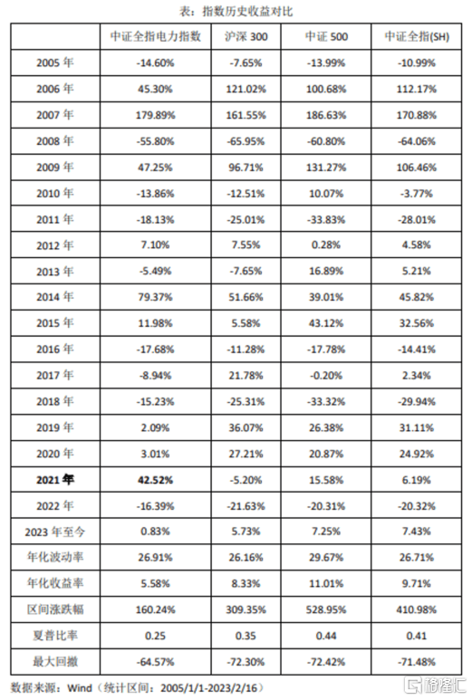 再來看過往收益率,據(jù)WIND統(tǒng)計(jì)顯示,自基日(2014年12月31日)以來,截至2023年2月16日,中證全指電力指數(shù)年化收益率約5.6%,整體表現(xiàn)落后于大盤基準(zhǔn)(中證全指)。此外,該指數(shù)的年化波動(dòng)率為26.9%,同樣低于部分大盤指數(shù)。不過自2021年起,由于電力市場化改革的加速,該指數(shù)取得了42.5%的收益,遠(yuǎn)遠(yuǎn)領(lǐng)先其他大盤指數(shù)。同時(shí),其2022年的表現(xiàn)也領(lǐng)先大盤指數(shù)。