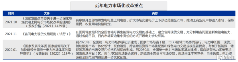 2019年9月,我國將煤電上網(wǎng)電價(jià)機(jī)制由標(biāo)桿電價(jià)改為“基準(zhǔn)浮動(dòng)”機(jī)制。2021年10月8日,國常會即提出改革完善煤電價(jià)格市場化形成機(jī)制,提出燃煤發(fā)電量原則上全部進(jìn)入市場,浮動(dòng)范圍擴(kuò)大至正負(fù)20%,高耗能行業(yè)電價(jià)不受限制。
