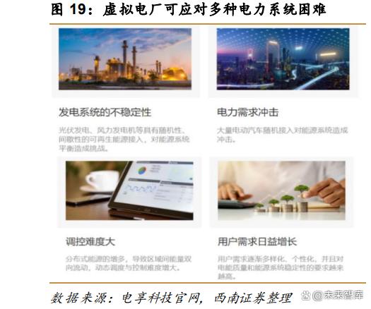 虛擬電廠具有需求側響應、多負荷管理等多種功能,可應對發(fā)電系統(tǒng)多樣化困難。虛擬 電廠可以應對發(fā)電系統(tǒng)不穩(wěn)定性(風光隨機性和間歇性對能源系統(tǒng)平衡造成挑戰(zhàn))、電力需 求沖擊(大量電動汽車隨機接入,對能源系統(tǒng)造成沖擊)、調控難度大(分布式能源增多, 導致動態(tài)調度與控制難度提升)和用戶需求日益提升等多種困難。