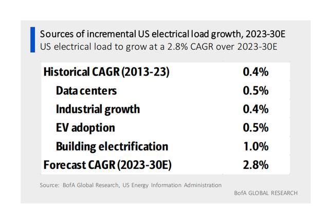 美銀美林在最新發(fā)布的研報(bào)中表示,隨著AI技術(shù)的飛速發(fā)展,美國電網(wǎng)的電力需求將面臨著前所未有的增長,預(yù)計(jì)2023年至2030年,美國電力需求將以2.8%的年復(fù)合增長率(CAGR)增長。