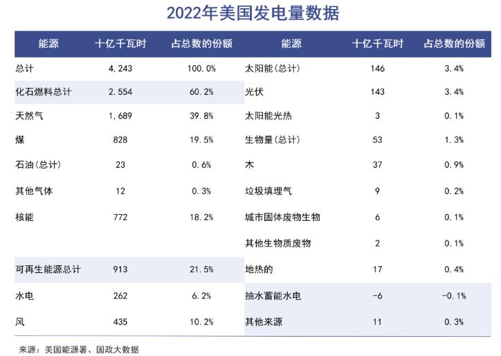 在《通脹削減法案》的刺激下,美國在新能源的道路上疾馳,煤電貢獻度明顯下降,風光等可再生能源逐漸成為主力軍。2022年,美國煤電份額從23%減少到20%,核能從20%減少到18%。