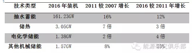 以2011年為分界點,前5年儲熱裝機增速最快,較2007年增加7倍,后5年化學(xué)儲能則成為發(fā)展最快的技術(shù),詳見表3。