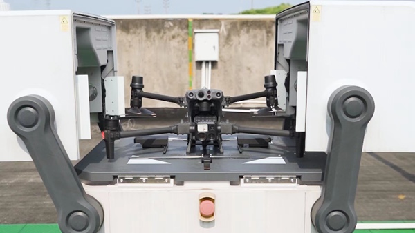 無人機(jī)從機(jī)巢飛出自主巡檢。國網(wǎng)重慶市電力公司供圖