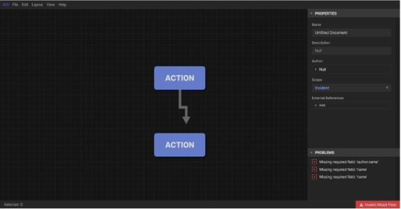 2.攻擊鏈建模編輯器:在瀏覽器中運行,幾分鐘內(nèi)便可完成攻擊流程的創(chuàng)建。該編輯器提供了一個工作空間,用戶可以輸入攻擊行動及其他背景信息,通過繪制箭頭,用戶可將這些信息編織成一個攻擊流程,明確展示事件或活動中觀察到的攻擊技術(shù)執(zhí)行順序。