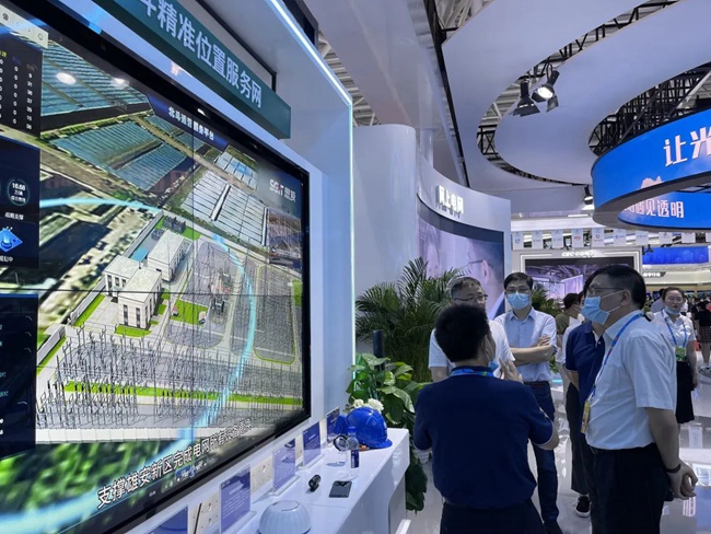 國網(wǎng)信通產(chǎn)業(yè)集團工作人員介紹電力北斗精準位置服務網(wǎng)。