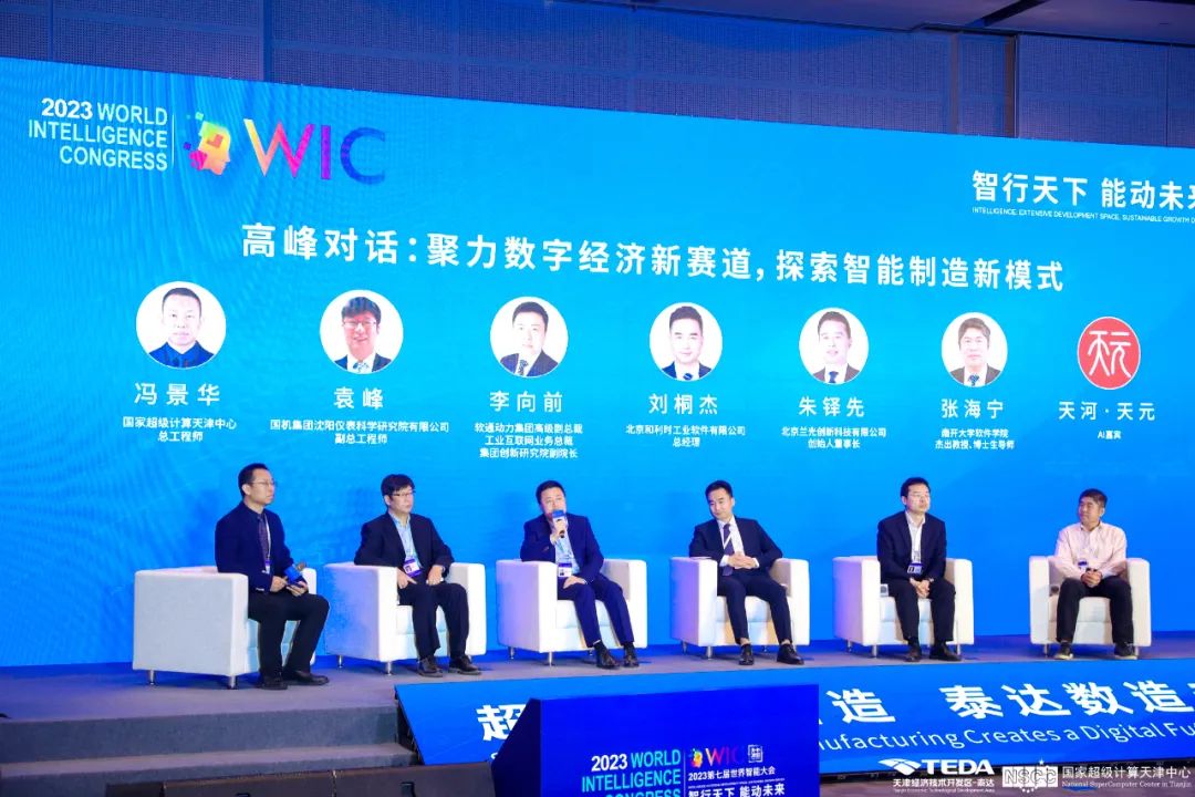 高峰對話環(huán)節(jié)由國家超級計(jì)算天津中心總工程師馮景華主持,圍繞“聚力數(shù)字經(jīng)濟(jì)新賽道,探索智能制造新模式”主題展開探討。國機(jī)集團(tuán)沈陽儀表科學(xué)研究院有限公司副總工程師袁峰;軟通動力集團(tuán)高級副總裁,工業(yè)互聯(lián)網(wǎng)業(yè)務(wù)總裁,集團(tuán)創(chuàng)新研究院副院長、李向前;北京和利時工業(yè)軟件有限公司總經(jīng)理、劉桐杰;北京蘭光創(chuàng)新科技有限公司創(chuàng)始人、董事長,朱鐸先;南開大學(xué)軟件學(xué)院、杰出教授、博士生導(dǎo)師、張海寧;以及神秘的 AI 嘉賓-天河·天元,現(xiàn)場共話智能制造新模式,推動數(shù)字經(jīng)濟(jì)發(fā)展。