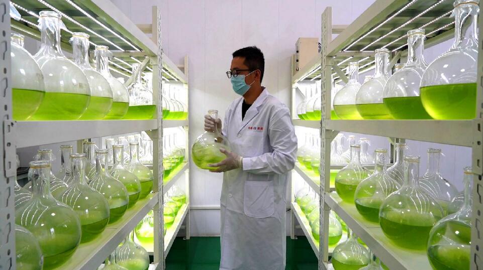 形態(tài)各異的容器中,微藻或深或淺、綠意萌動……山西安泰集團(tuán)公司利用自主研發(fā)系統(tǒng)捕捉燃煤煙氣所含的二氧化碳,作為微生物微藻的生長基,生成高附加值、高營養(yǎng)價值的藻粉產(chǎn)品。