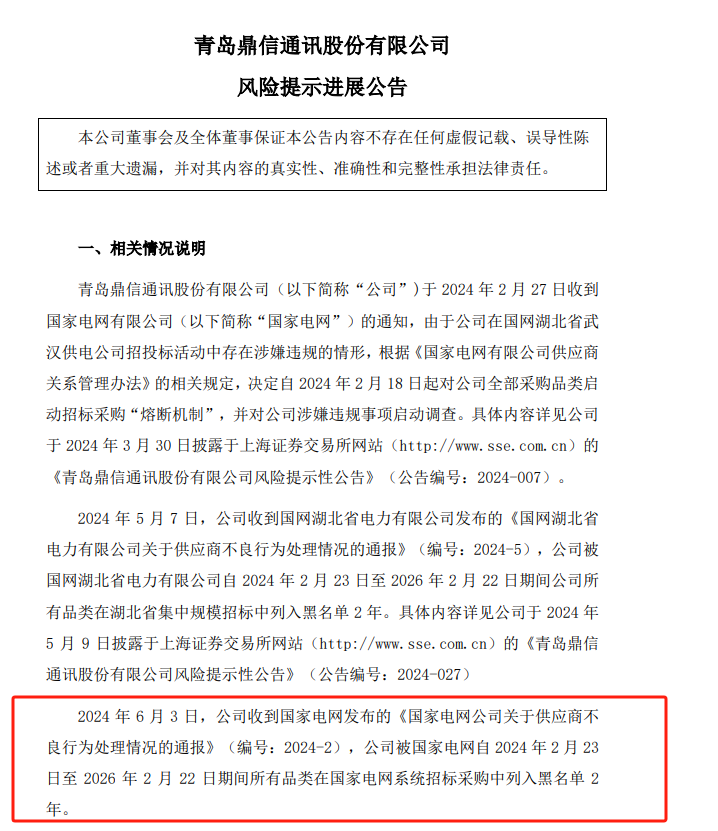 鼎信通訊6月4日晚間公告,6月3日,公司收到國家電網(wǎng)發(fā)布的《國家電網(wǎng)公司關于供應商不良行為處理情況的通報》,公司被國家電網(wǎng)自2024年2月23日至2026年2月22日期間所有品類在國家電網(wǎng)系統(tǒng)招標采購中列入黑名單2年。