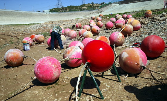劉家峽水電廠壩前浮球阻攔系統(tǒng)是為防止船舶或人員靠近泄水區(qū)域發(fā)生意外事故而設(shè)置的安全防護(hù)設(shè)施和安全標(biāo)識(shí),主要由浮球、浮箱、滑道、塔架、圍欄及連接鋼絲繩等部件組成。這次維修主要是對(duì)2019年汛后檢查中發(fā)現(xiàn)的30個(gè)已損壞下沉浮球、連接浮球的繩卡進(jìn)行維修,對(duì)浮箱、鋼塔架和滑道等進(jìn)行防腐處理以恢復(fù)其功能。