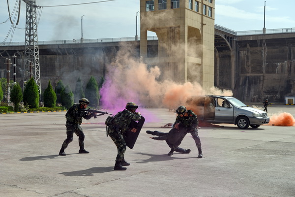 此次演練模擬恐怖分子挾持施工單位車輛,偽裝成施工人員在上班高峰期混入生產(chǎn)區(qū)域,并攜帶爆炸物意圖對大壩、330千伏開關(guān)站等重點(diǎn)部位實(shí)施爆炸破壞,在尋找時(shí)機(jī)實(shí)施破壞活動時(shí)被該廠測溫人員發(fā)現(xiàn),在上前詢問、檢查證件時(shí)恐怖分子身份暴露,隨后挾持測溫人員,強(qiáng)行進(jìn)行爆炸破壞活動,最終被駐廠武警戰(zhàn)士和縣公安局防爆警察制服并成功解救被挾持人質(zhì)為場景。
