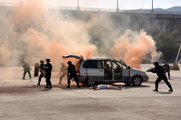 刺耳的警笛響起,縣公安局、縣消防救援大隊(duì)、醫(yī)療救援機(jī)構(gòu)車輛疾馳趕往事發(fā)地點(diǎn),3名恐怖分子與武警戰(zhàn)士、防暴警察展開對峙。