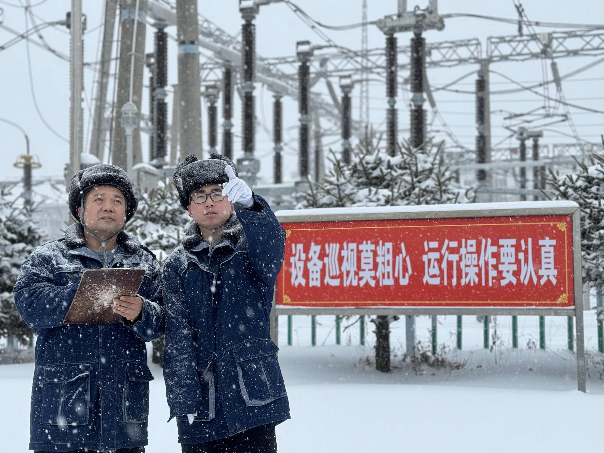 11月26日,降雪期間,黑龍江鶴崗供電公司運維人員巡視檢查220千伏鹿金山變電站,護航電網(wǎng)安全穩(wěn)定運行(封沂池 攝)
