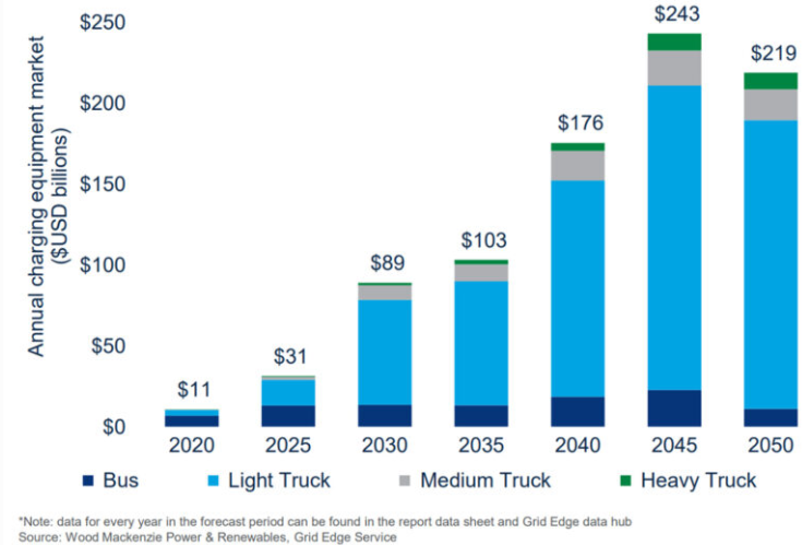 伍德·麥肯齊(Wood Mackenzie)近日發(fā)布的一份報(bào)告顯示,預(yù)計(jì)到2045年,電動(dòng)汽車充電基礎(chǔ)設(shè)施市場規(guī)模將達(dá)到2430億美元,而在隨后的五年中,電動(dòng)汽車充電基礎(chǔ)設(shè)施的市場規(guī)模將下降近250億美元,降至2190億美元。