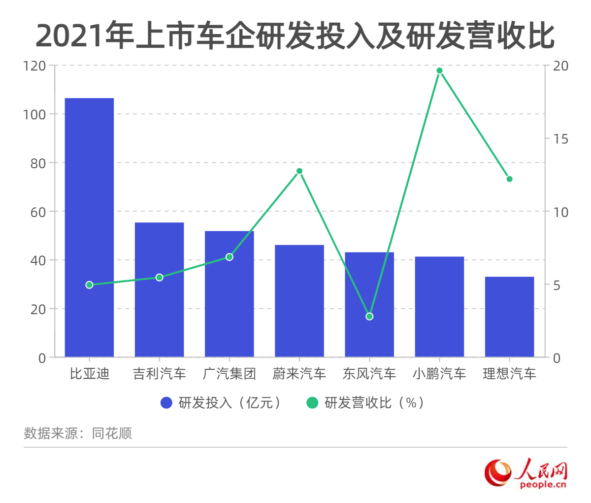 從各家車企的研發(fā)投入來看,A股比亞迪、北汽藍谷2021年研發(fā)投入同比分別增長24.2%、24.1%,中概股“蔚小理”研發(fā)投入同比分別增長86.4%、138.4%和198.8%。