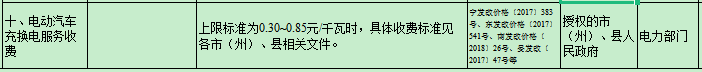 電動(dòng)公交車充電服務(wù)費(fèi)上限標(biāo)準(zhǔn)為0.60~0.9元/千瓦時(shí);其他電動(dòng)汽車充電服務(wù)費(fèi)上限標(biāo)準(zhǔn)為0.65~1.1元/千瓦時(shí);充換電服務(wù)費(fèi)上限標(biāo)準(zhǔn)為0.60元/公里(包括電費(fèi)、電池租賃和充換電服務(wù)等費(fèi)用),具體收費(fèi)標(biāo)準(zhǔn)見各市、縣相關(guān)文件。