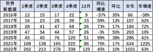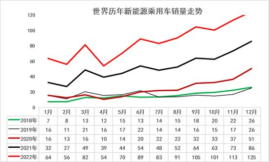 *2022年世界新能源乘用車走勢(shì)較強(qiáng),1-12月達(dá)到1031萬臺(tái),同比增長(zhǎng)63%。其中12月銷量125萬臺(tái),同比增長(zhǎng)45%。