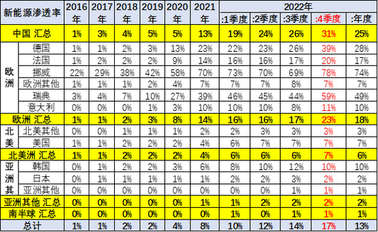 世界新能源車滲透率總體呈現(xiàn)快速提升趨勢(shì),2022年已經(jīng)達(dá)到13%水平,其中中國(guó)新能源滲透率達(dá)到25%,德國(guó)達(dá)到28%,挪威達(dá)到74%,美國(guó)僅有7%,日本僅有2%,因此世界新能源發(fā)展的不均衡性極為明顯。隨著美國(guó)加大新能源的鼓勵(lì)政策,世界新能源車進(jìn)入強(qiáng)勢(shì)發(fā)展的新階段。