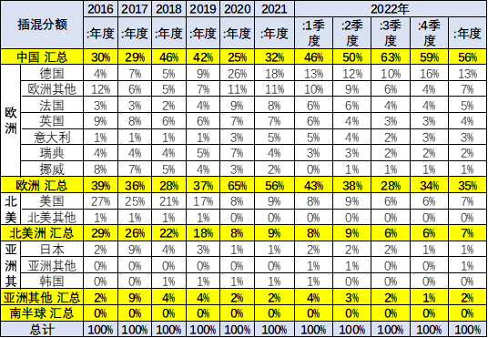 2022年的世界新能源車結(jié)構(gòu)是中國(guó)偏純電動(dòng)。歐洲主力國(guó)家市場(chǎng)插混較強(qiáng),歐洲市場(chǎng)結(jié)構(gòu)的純電與插混持平的特征明顯,挪威等非汽車生產(chǎn)國(guó)家的純電動(dòng)較強(qiáng)。
