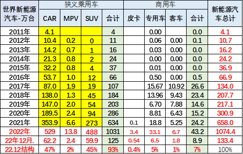 從上面數(shù)據(jù)看,專用車和客車只有中國(guó)市場(chǎng)比較強(qiáng),世界其它市場(chǎng)銷量微乎其微,因此暫不分析世界商用車,世界新能源汽車主要專指新能源乘用車。今年1-12月新能源乘用車銷量1031萬臺(tái),商用車銷量43.2萬臺(tái),未來世界電動(dòng)皮卡的銷量是我們關(guān)注重點(diǎn)。