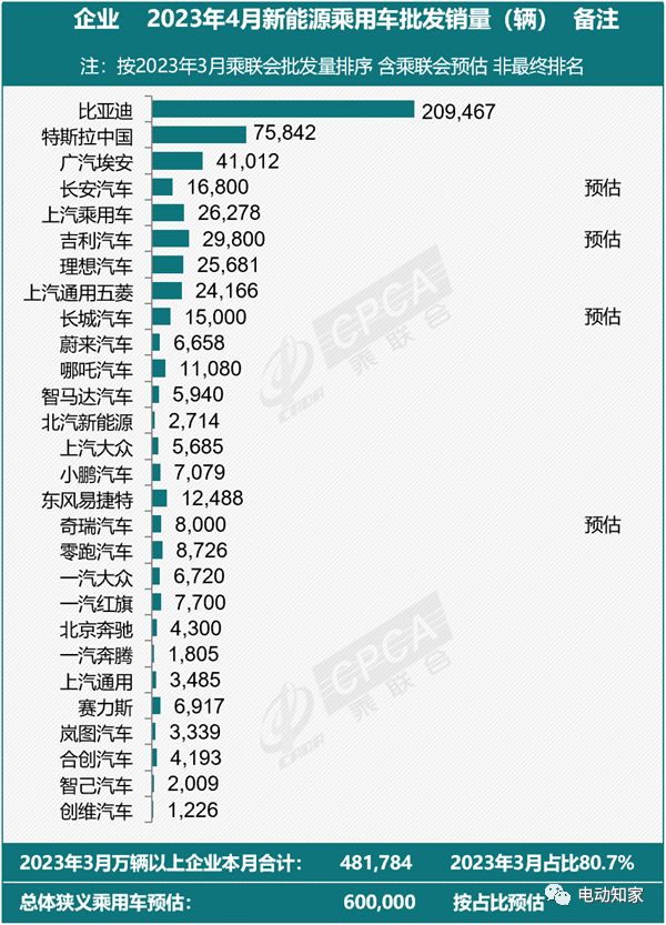 日前,乘聯(lián)會(huì)公布4月新能源乘用車廠商批發(fā)銷量排名,比亞迪以209467臺(tái)位列第一,特斯拉中國(guó)以75842臺(tái)位列第二,廣汽埃安以41012臺(tái)位列第三。