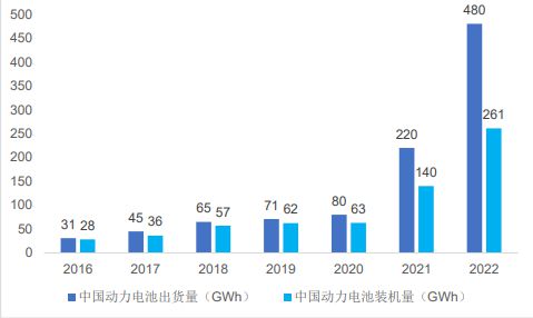 2016-2022 年中國(guó)動(dòng)力電池出貨量及裝機(jī)量