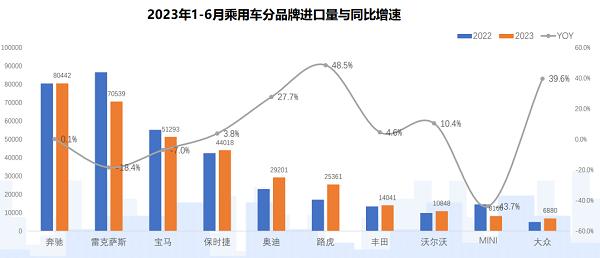 今年上半年,進口車前十品牌中,奔馳、保時捷、奧迪、路虎、豐田、沃爾沃、大眾等七個品牌實現(xiàn)正增長;其中,奔馳同比上升0.1%至80442輛,排名第一。而寶馬和MINI,則由于車型國產(chǎn)導(dǎo)致銷量分別下滑7%和43.7%;雷克薩斯也因為主力車型ES系列銷量疲軟下滑了18.4%。