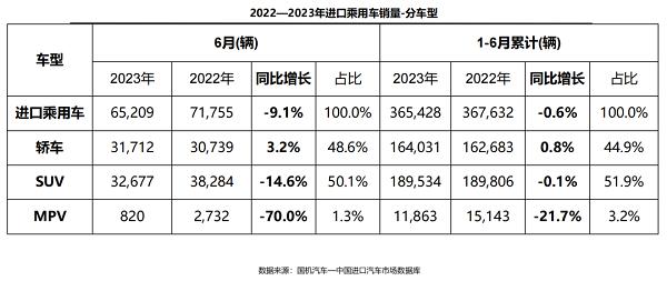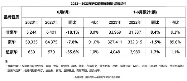 銷量方面,6月,進口乘用車終端銷售6.5萬輛,結(jié)束了連續(xù)四個月的增長態(tài)勢。同比下滑9.1%,環(huán)比增長6.6%。1-6月,進口乘用車?yán)塾嬩N售36.5萬輛,同比微降0.6%。