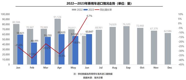 今年6月,我國乘用車進口6.1萬輛(含底盤),同比增長6.7%;1-6月累計進口33.8萬輛,同比下滑23.3%,主要原因為國內(nèi)市場消費結(jié)構(gòu)改變及電動化轉(zhuǎn)型降低了對燃油車的需求。銷量方面,6月,進口乘用車終端銷售6.5萬輛,同比下滑9.1%,環(huán)比增長6.6%。1-6月,進口乘用車?yán)塾嬩N售36.5萬輛,同比微降0.6%;相比之下,新能源進口車銷量同比漲幅接近七成。