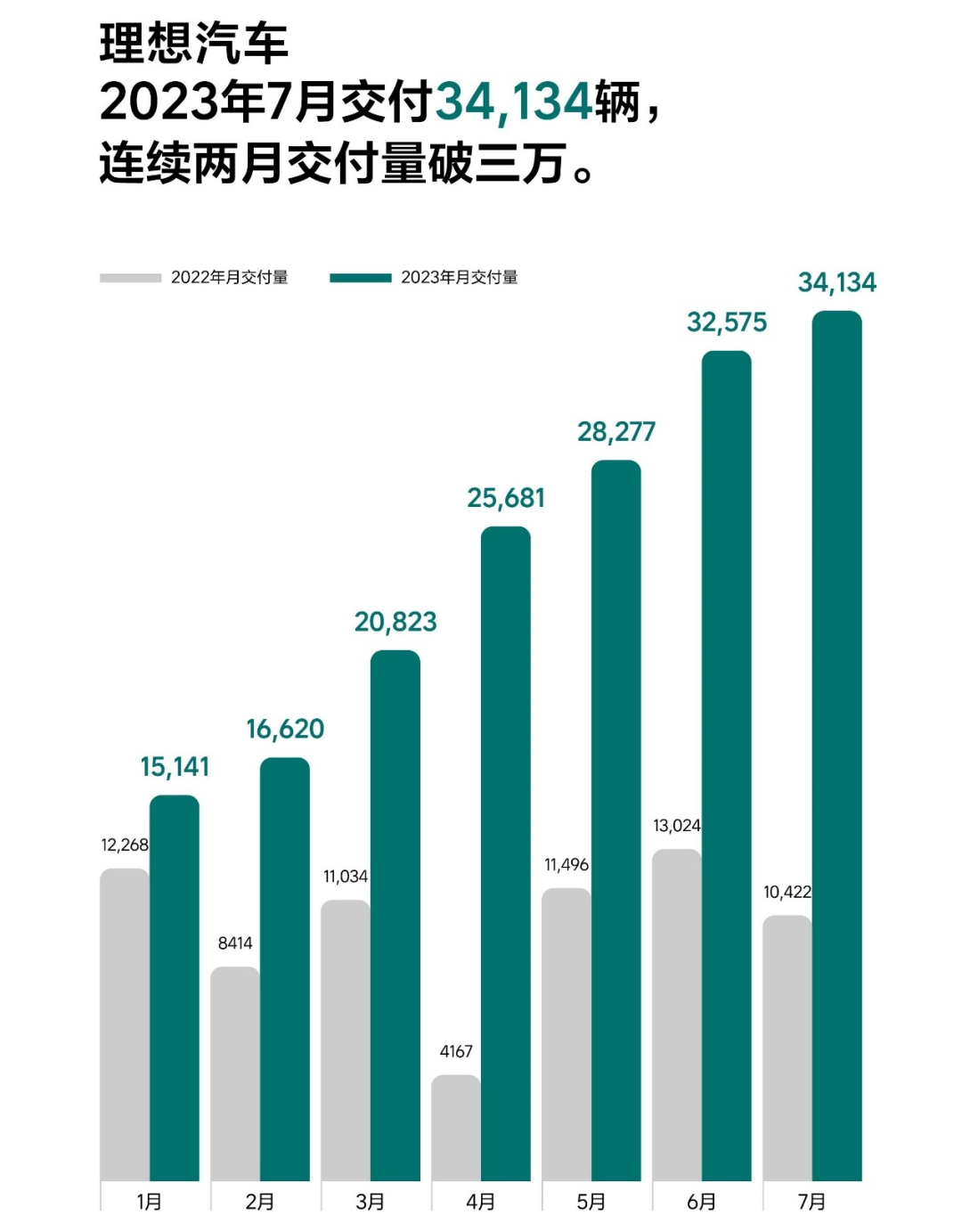7月,理想汽車共交付34134輛,同比增長227.5%、環(huán)比增長4.8%。