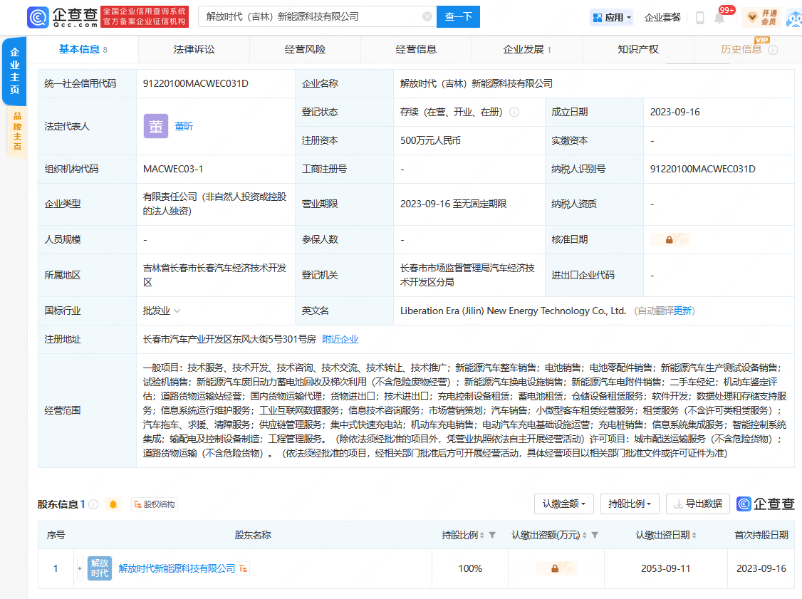 近日,解放時代(吉林)新能源科技有限公司成立,法定代表人為董昕,注冊資本500萬人民幣,經(jīng)營范圍含新能源汽車整車銷售、電池銷售、電池零配件銷售、電動汽車充電基礎(chǔ)設(shè)施運(yùn)營;充電樁銷售;信息系統(tǒng)集成服務(wù);智能控制系統(tǒng)集成;輸配電及控制設(shè)備制造等。股權(quán)全景穿透圖顯示,該公司由解放時代新能源科技有限公司全資持股,后者由一汽解放汽車有限公司、寧德時代分別持股50%。