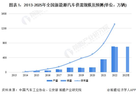 新能源汽車是我國(guó)應(yīng)對(duì)氣候變化、推動(dòng)綠色發(fā)展的戰(zhàn)略舉措,在政策和市場(chǎng)需求的推動(dòng)下,我國(guó)新能源汽車產(chǎn)銷量雙雙增長(zhǎng),2022年,全國(guó)新能源汽車實(shí)現(xiàn)產(chǎn)量705.8萬(wàn)輛、實(shí)現(xiàn)銷量688.7萬(wàn)輛;同時(shí),據(jù)公安部數(shù)據(jù)顯示,截至2022年末,全國(guó)新能源汽車保有量已達(dá)1310萬(wàn)輛,占汽車總量的4.10%。根據(jù)國(guó)務(wù)院印發(fā)的《新能源汽車產(chǎn)業(yè)發(fā)展規(guī)劃(2021-2035年)》,未來(lái)幾年我國(guó)新能源汽車行業(yè)仍將保持高速發(fā)展態(tài)勢(shì),至2025年,新能源汽車新車銷售量達(dá)到汽車新車銷售總量的20%左右,預(yù)計(jì)銷量將突破700萬(wàn)輛。