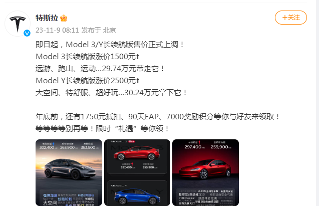 11月9日,特斯拉官方微博發(fā)布消息,即日起,Model 3/Y長續(xù)航版售價正式上調(diào),Model 3長續(xù)航版漲價1500元至29.74萬元。Model Y長續(xù)航版漲價2500元至30.24萬元。