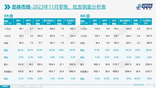 11月,國(guó)內(nèi)狹義乘用車生產(chǎn)、批發(fā)、零售端皆呈現(xiàn)同環(huán)比雙增長(zhǎng)的有力表現(xiàn),并連續(xù)第三個(gè)月齊齊站上200萬(wàn)輛關(guān)口。1-11月,狹義乘用車生產(chǎn)、批發(fā)、零售累計(jì)增速繼續(xù)擴(kuò)大,分別達(dá)到7.4%、8.9%和5.3%,較1-10月各自提升1.9、1.7和2.1個(gè)百分點(diǎn)。