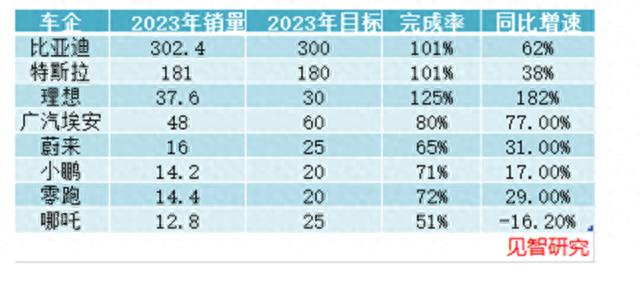 在2023年,新能源汽車市場的競爭特征是價格戰(zhàn)頻繁、新車型連續(xù)推出、新技術(shù)不斷引入。頭部車企在這一年中保持了較高的銷量完成度,顯示出強大的市場競爭力。相比之下,造車新勢力的表現(xiàn)則不一,有的超額完成目標,有的則難以達到預(yù)期,顯示出市場的分化趨勢。