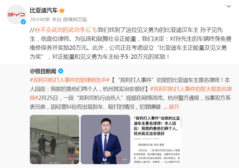 比亞迪對(duì)勸架車主獎(jiǎng)勵(lì)20萬(wàn)元