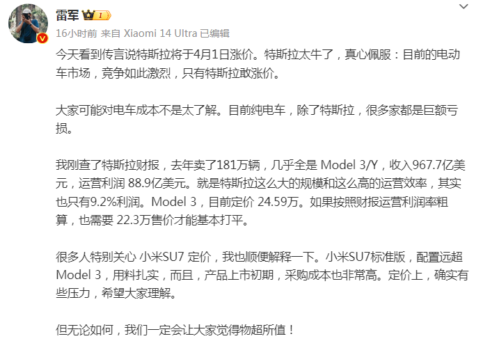 雷軍還提到了小米SU7的定價,他表示:“小米SU7標準版,配置遠超 Model 3,用料扎實,而且,產品上市初期,采購成本也非常高。定價上,確實有些壓力,希望大家理解。”