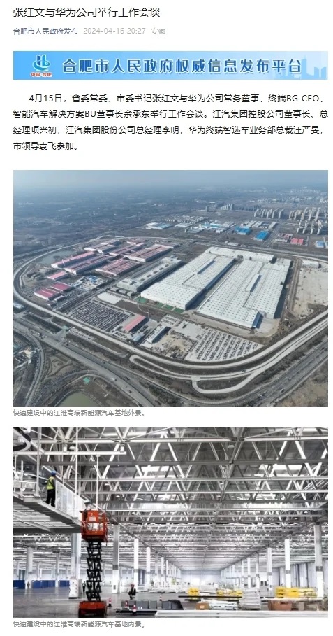 2023年12月,江淮汽車發(fā)布公告稱,與華為終端有限公司簽署《智能新能源汽車合作協(xié)議》。雙方將基于華為智能汽車解決方案,在產(chǎn)品開發(fā)、生產(chǎn)制造、銷售、服務(wù)等多個(gè)領(lǐng)域全面合作,著力打造豪華智能網(wǎng)聯(lián)電動(dòng)汽車。
